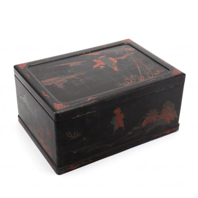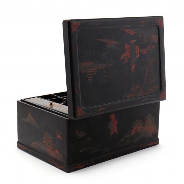 Early 20th century, exterior with black lacquer ground and red decoration, cover with a scholar and attendant under bamboo looking at a distant temple, sides decorated with Buddhist treasure symbols and riverscape scenes, top opens to reveal compartments, some covered, for sewing notions, interior decorated with green, red, gold, and black lacquer of riverscape scenes, comes together with original key, also contains sewing notions from previous owner.