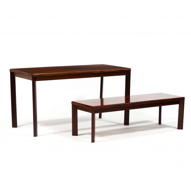 1960s, including a rectangular console table with banded edge, on rounded legs, with a conforming low table, labeled.