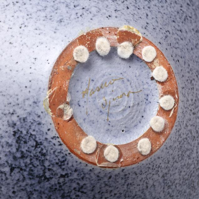 Circa 1990, hollow formed ceramic with wide rim having a sliced edge, mottled steel/purple interior glaze with linear pattern, teal rim, repeating mottled exterior glaze with red glazed slice edges, signed.