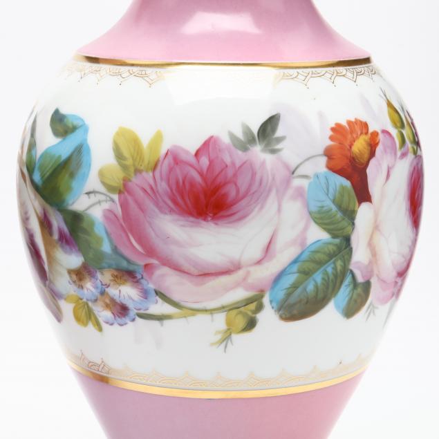 Mid-19th century, baluster form with hand-painted floral garlands featuring roses, tulips, and forget-me-nots to waists, the neck and base with powder pink ground, gilt details throughout, unmarked.