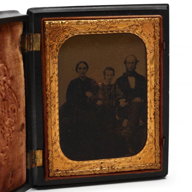 Circa 1860s, consisting of a quarter plate case depicting a late 17th century cavalier and maiden, the tintype image within being a family group; plus a double sixth plate case decorated with a mother, child and dog, the interior with tintypes, likely of a mother and her son; the third case is octagonal and is molded with a Renaissance period chess match, no image within.