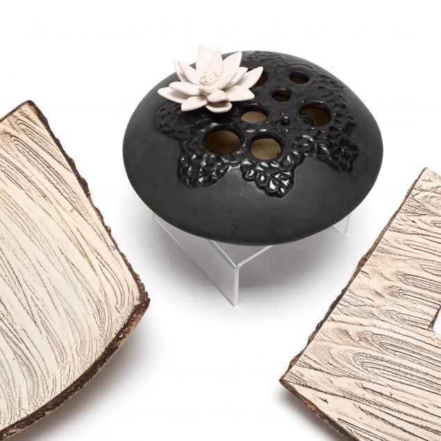 Including two square dishes with illegible signature; and a black glazed flower frog bowl with applied lily signed Sara (Japanese Pottery).