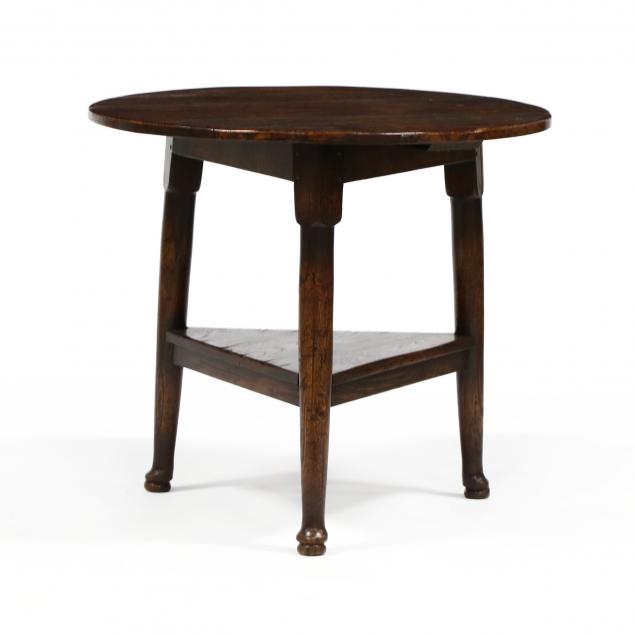 Late 20th century, circular top with faux pegged construction, raised on three rounded legs, lower shelf, on pad feet.