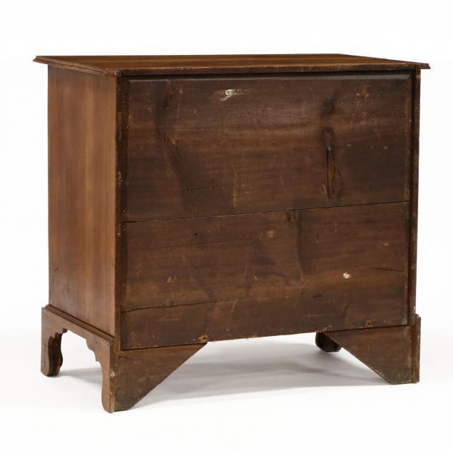 Late 18th century, white pine secondary, top with molded edge, four graduated drawers, drawer stiles with raised edge, raised on shaped bracket feet.