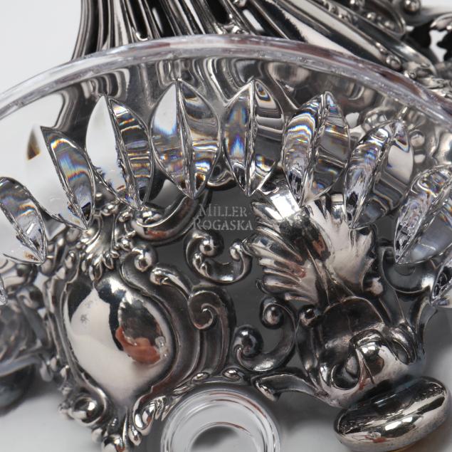 Early 20th century, model number 800, five light form with later cut crystal bowls by Miller Rogaska allowing for use as epergnes.