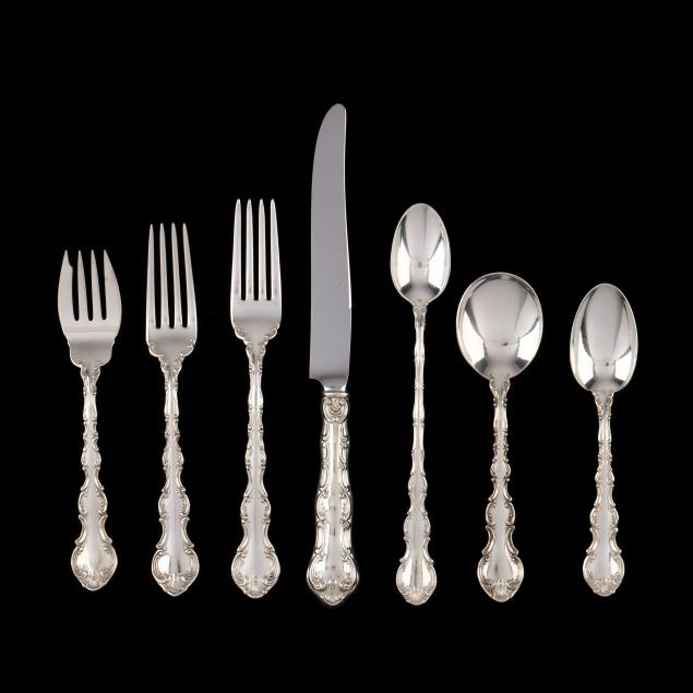 (79) pieces including: (14) knives (9 5/8 in.); (3) forks (7 5/8 in.); (2) forks (7 in.); (11) forks (7.5 in.); (14) salad forks; (16) teaspoons; (8) cream soup spoons; (4) iced tea spoons; dessert / oval soup spoon; master butter knife; tomato server; sugar spoon; tablespoon; gravy ladle; and serving fork. No monograms, mix of old and newer hallmarks.