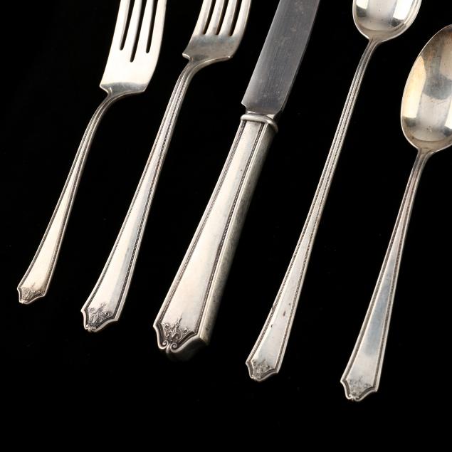 (50) pieces including: (5) knives (9.25 in.); (8) forks (7 5/8 in.); (8) salad forks; (11) teaspoons; (8) iced tea spoons; (8) tablespoons; sugar spoon; and master butter knife. No monograms.