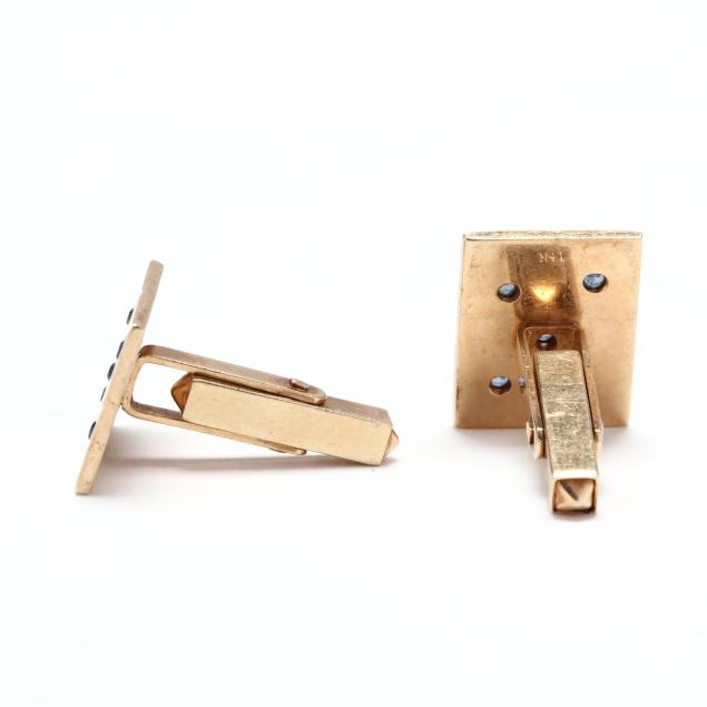 Of rectangular form with line engraving and with blue stone accents, completed with toggle closures and stamped 14K.