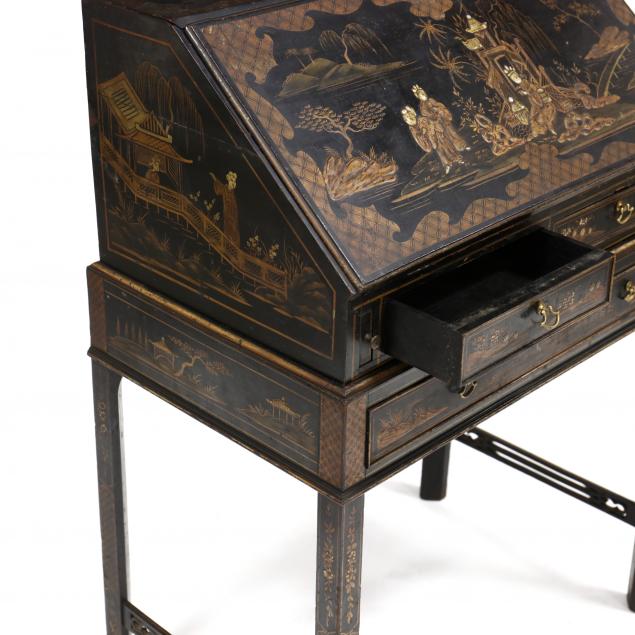 Early 20th century, two-part form, black lacquer with gilt highlights, fall front lid featuring figures in a courtyard, divided and drawered interior with foliate decoration, case with two over one decorated drawers, raised on straight square legs with inside chamfer and stretcher base.