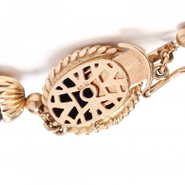 To include: a round (7.70mm -10.2mm) and corrugated lozenge (9.3 x 17.5 mm) malachite and gold bead necklace with a filigree clasp, tested 14KT (30 in.); and round lapis (9.0mm) and corrugated gold ball bead necklace with an oval lapis clasp, stamped 14K (25 in.).
