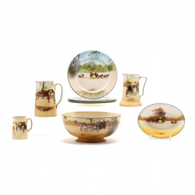 Including four rare natural color palette plates (10.5 in.); traditional color palette footed center bowl (5 1/8 x 11.75 in.) (some crazing); an oval serving dish; three pitchers (largest 7.5 in.) (small pitcher with edge roughness and tight hairline).