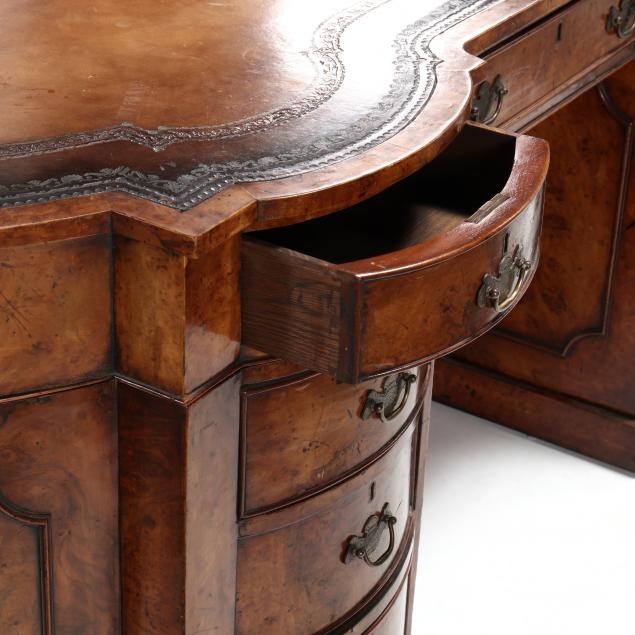 Circa 1900, three-part form, oak secondary, shaped top with embossed leather, each side with nine cockbeaded graduated drawers, bowed sides, flush base.