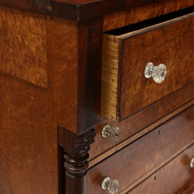 First half 19th century, white pine secondary, case with mahogany veneers, upper projecting drawer over three graduated drawers each with mahogany edge inlay, flanked by fully turned and carved columns, with sandwich glass pulls, raised on turned feet.