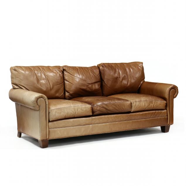 Brown leather, loose velcro cushions, raised on tapered mahogany block feet, labeled.