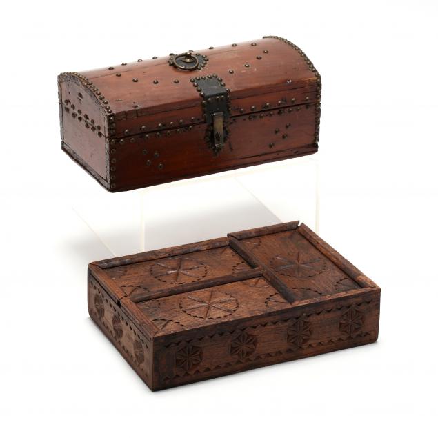 Including a 19th century domed lid box with nail head trim with paper lined interior; the second is a 20th century Pennsylvania Dutch style box with relief carving, three sliding panels with divided interior.