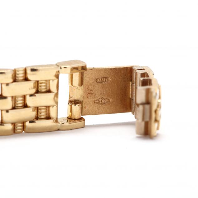 Quartz movement, the round gold case with diamond set bezel, with signed mother-of-pearl dial and diamond hour markers at the 3, 6, 9, and 12 hour points, with diamond set bar lugs joined to a woven bracelet band with fold over clasp, case back signed, stamped 18K, with Swiss hallmark and numbered 2829065 / MVO35074. The single cut diamond melee accents weigh approximately .62 total carat (G-H color, VS clarity).