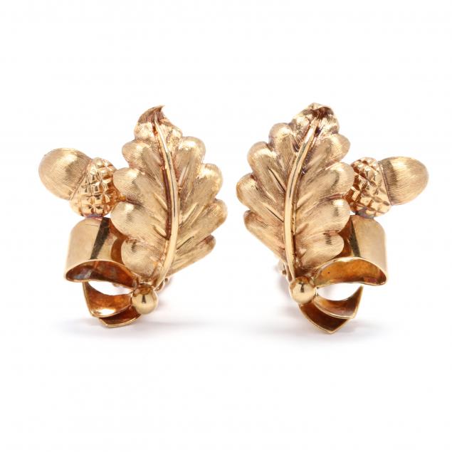 Designed in textured yellow gold in an oak leaf and acorn motif, completed with clip backs stamped 18K / Italy and likely a spurious signature for Tiffany & Co.