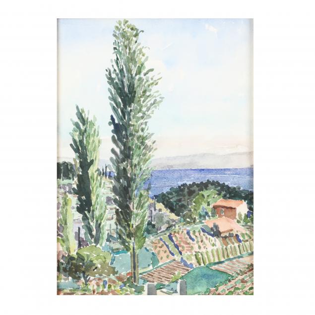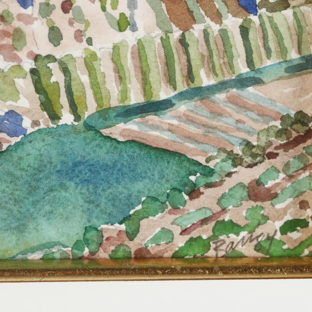 Watercolor on paper, illegibly signed at lower right, matted and framed under glass.