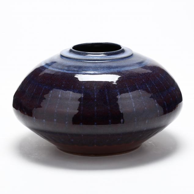 Seagrove, NC., wheel thrown stoneware, squat form with a brilliant gradient glaze, signed on the bottom.