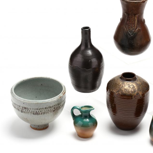 Eight pieces: a stamped ER Kennerly bottle vase (7.5 in.); a Gordy "Mountain Gold" coffee mug; others unsigned or unidentified.