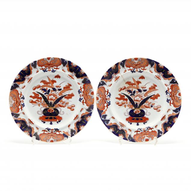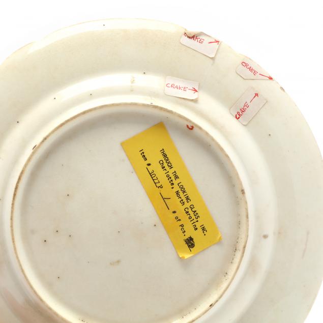 Late 19th-early 20th century; a footed ironstone bowl (4.75 x 8.75 in.) (minor gilt loss); a semi-porcelain platter (16 in.); ironstone platter (10 7/8 in.) (hairlines); five plates with hairlines/staining, one with large edge chip.