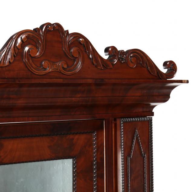 Cincinnati, Ohio, mid 19th century, stencil mark to the back, multi-part form, mahogany veneers, white pine and poplar secondary, double cove molded finely veneered cornice surmounted by an acanthus leaf carved pediment, central looking glass with two iron candlearms, flanked by two hinged cabinet doors with shelved interior, base with central marble top flanked by two hinged horizontal lidded compartments, above two central large deep drawers flanked by two hinged cabinet doors with shelved interior, raised on distinctive front ogee and demilune feet, allover ribbon moldings.