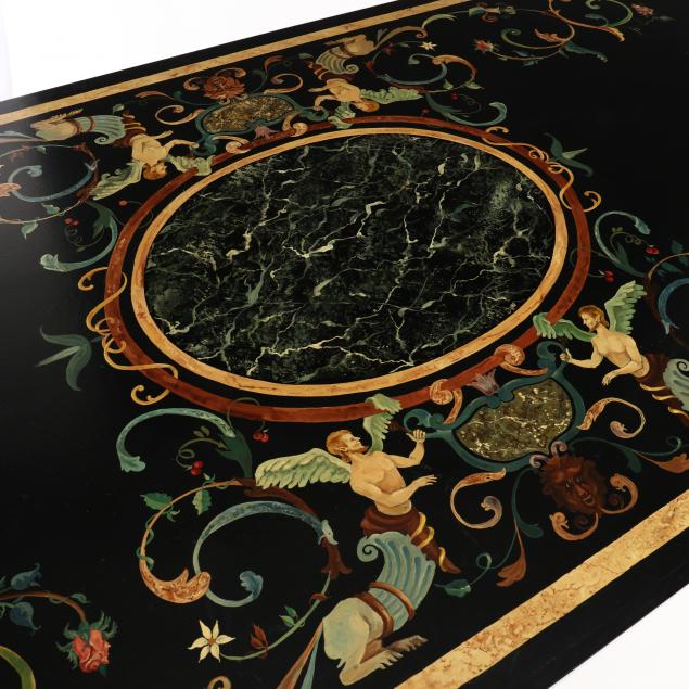 Late 20th century, made by Herbert Gerst and hand-painted by his wife Millicent Gerst, large rectangular top with black field featuring Venetian panels, sphinx figures, grape and foliate scroll design, raised on two rectangular paneled legs and feet with faux marble paint decoration and ormolu mounts.