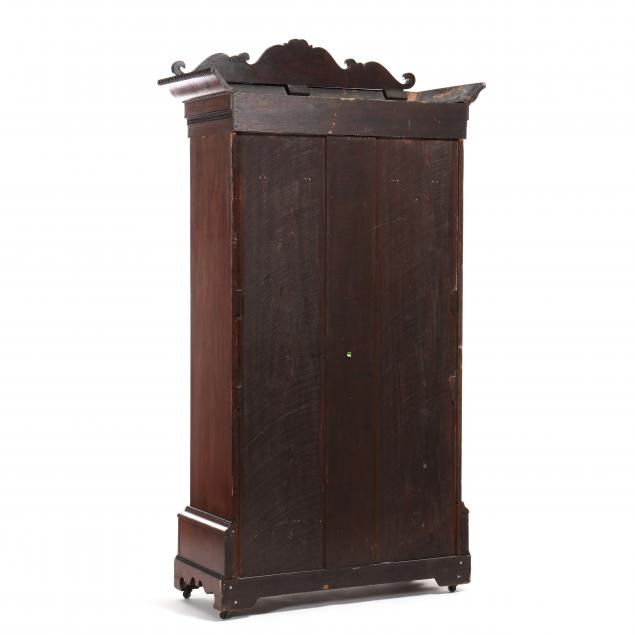 Cincinnati, Ohio, mid 19th century, stencil mark to the back, mahogany veneer, poplar secondary, multi-part form, scrolled pediment with applied acanthus leaf design above a vertically veneered highly figured cove molded cornice above a vertically veneered frieze, double layer ribbon molding divider, single hinged large door with central mirror above horizontal lower panel, interior with hooks for coats and hats, the base with single long drawer, scalloped skirt to front and sides, shaped bracket foot, applied ribbon molding throughout.