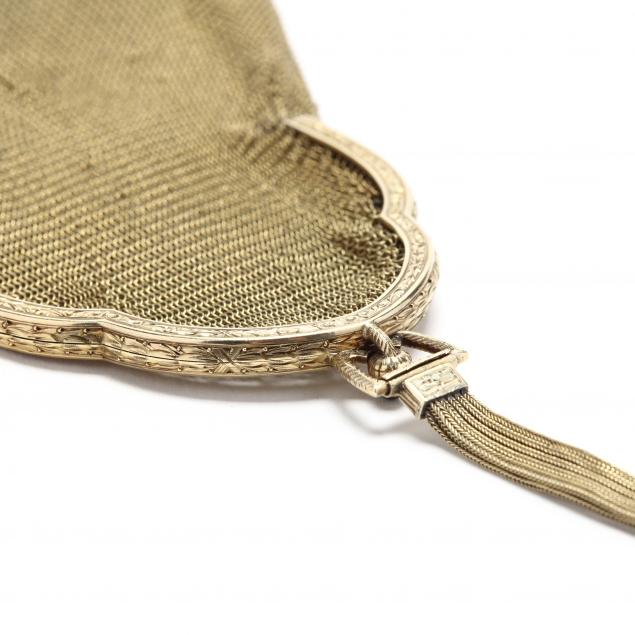 The shaped frame with engraved detailing and with cabochon sapphire set to clasp, the gold mesh purse suspending pearl tipped tassels and with a gold strap bracelet handle, stamped 14K and testing 14KT.