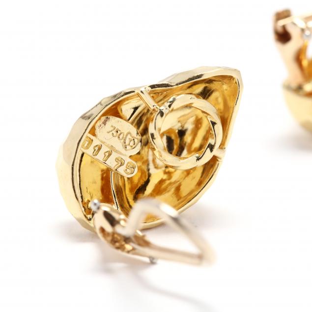 Designed in hand hammered yellow gold in a raised form, completed with omega clip backs, signed and stamped 18K, with maker's mark and stamped 750, numbered D1175.