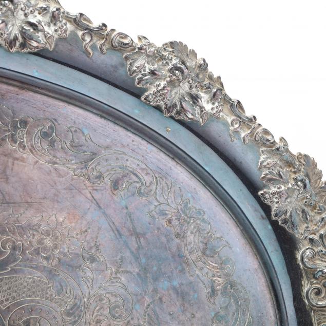 Mark of Ellis-Barker Silver Co. of Birmingham, early 20th century, oval form with double handles and raised on four acanthus scroll feet, engraving to well and grape vine motif to rim, no monograms.