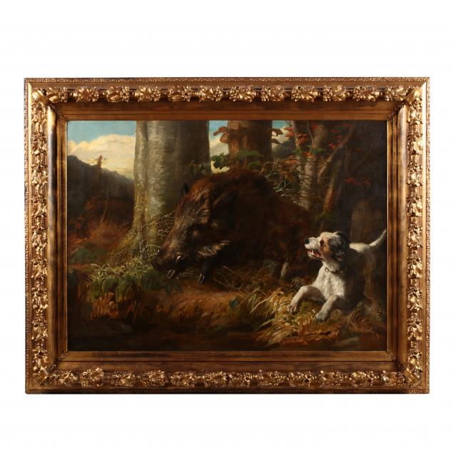 Oil on canvas (lined), signed at lower right, presented in an ornate period gilt composition frame with acorn and oak leaf border.
