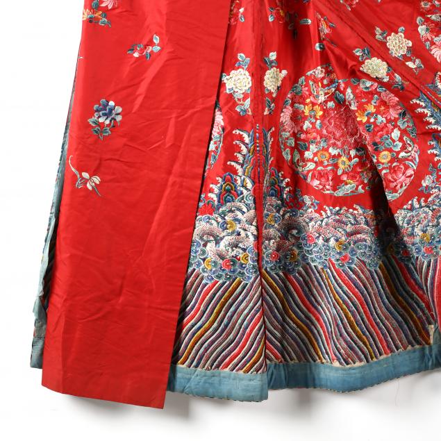 Qing dynasty (1644-1912), composed of red silk finely embroidered with eight silk roundels comprising large peonies, chrysanthemums, and butterflies, all amidst scattered flowers above a lishui border with ruyi and other auspicious emblems in the rolling waves, the black collar and wide cuffs are densely embroidered with flowers and butterflies, with gilt brocade trimming, horseshoe cuffs with same embroidery are detached but remain with robe.