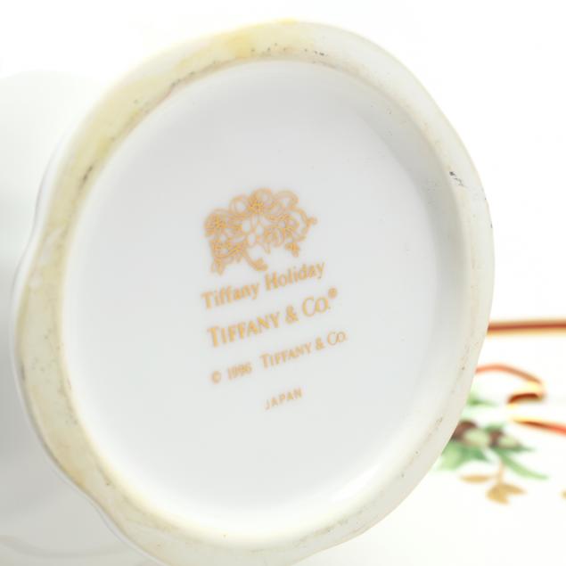 "Tiffany Holiday",a tray and pitcher, festooned with ribbons and fruit clusters, marked on the bottom, also three blue and white handled serving trays (14 7/8 in.)