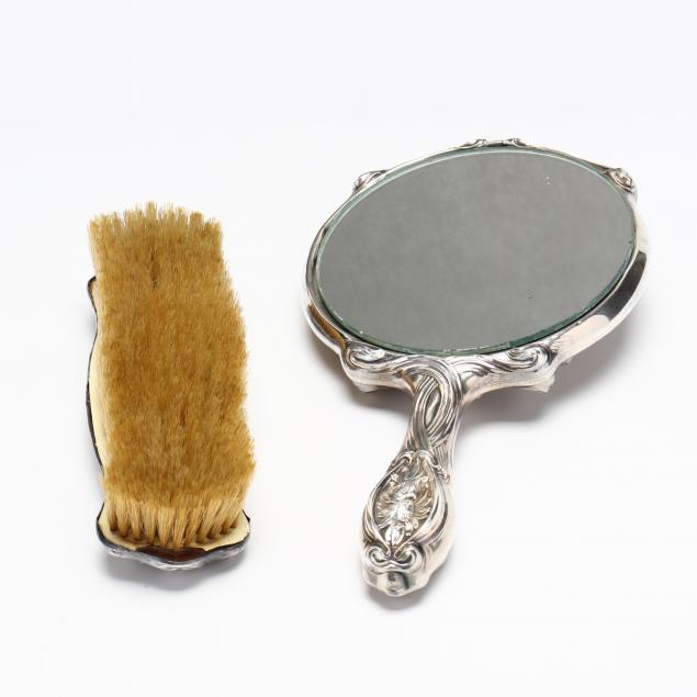 The hand mirror with Art Nouveau design of a woman with daisies (9.75 x 5.5 in.) (replaced mirror is loose, denting to silver); the clothesbrush with Art Nouveau design of a woman with irises, period script monogram, model number 0567 (LOA 7.5 in.) (some denting to silver, some minor loss to celluloid backing of brush).