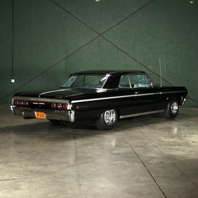 Original exterior per cowl tag was Silver Blue, received a repaint in Black that looks amazing and appears to be thorough with no evidence of original paint. Blue trim and interior seem to be original and condition indicates the car has been well preserved in a controlled environment, and mileage may be accurate. Equipped with an original turntable and the radio has been updated with a modern replacement that looks vintage. The factory tachometer mounted above the steering column, the SS stainless steel trim, and dash paint in in amazing condition for age.