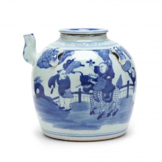 19th or 20th century, porcelain with blue underglaze, includes four platters of various sizes (15.25, 10.75, 9.25 in.; fretting to edges of largest platter, one medium platter with large repair, three platters with metal hangers to back), two bowls (9.25 in.; no condition concerns), six plates (9 in.; with metal hangers to back of four plates, fretting to rim edges; one with hairline cracks), two small barbed rim bowls (6 in.; one with rim chips, one with plastic hanger to back), a wine jug with cover, having four lug handles, decorated with boys playing (6.75 in.; scratches to underside)