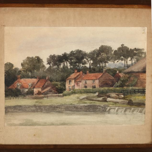 The first a watercolor on paper, unsigned, retaining an old hand-written label on the verso reading "Cottages at Deedham / Norfolk / Painted by Miss Riddington," matted and framed under glass (DOA 12.5 x 14 3/8 in.) (toning to sheet, laid down, foxing); the second a watercolor on paper of cottage in disrepair, unsigned, matted and framed under glass (DOA 9 5/8 x 12 in.) (laid down, toning to sheet, minor foxing).