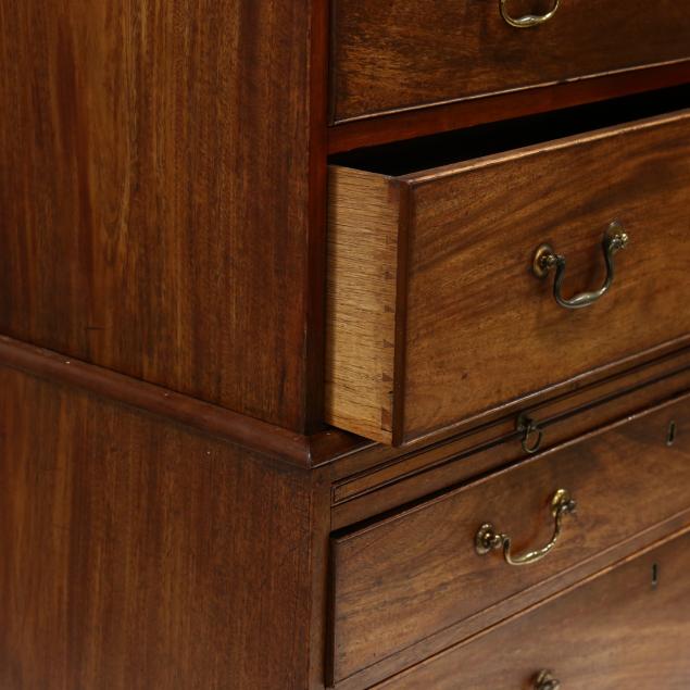 Late 18th century, oak secondary, two-part form, top panel with secret hinged compartment, cove molded cornice with Greek key trim, case with two-over-six graduated cockbeaded drawers, with central dressing slide, on shaped bracket feet.