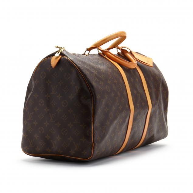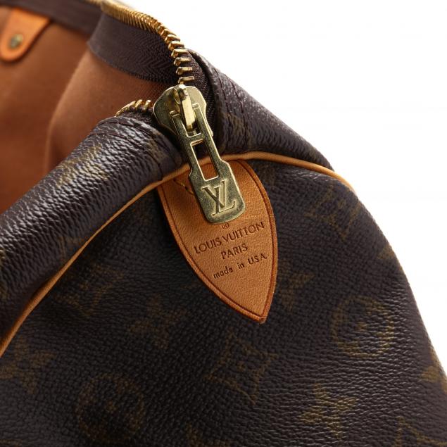 Made in France, a stylish bag crafted of signature Louis Vuitton monogram on coated canvas, with vachetta leather trim, rolled top handles, and polished brass hardware, the top zipper opens to a spacious cocoa brown fabric interior, with luggage tag. Date code SD1924.