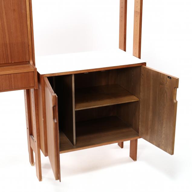 1960s, three-part form, two vertical bookshelves with hinged cabinet doors, drawers and a fall front cabinet, white laminate surface, flanking a central fall front desk with two flush drawers, louvered shelves, on flush feet, appears unmarked.