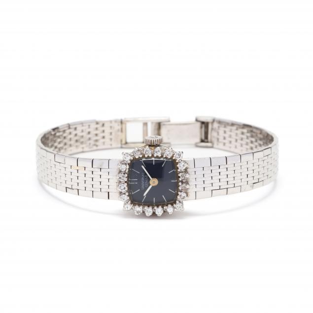 Manual wind with seventeen jewels, the case with diamond accents, with signed blue dial with white enamel bar hour markers, completed with a tapered bracelet band with channel fold over clasp, case stamped 18K / 911397 and clasp stamped Made in Italy / 18K. Diamond weight approximately .56 total carat (H-I color, SI clarity).
