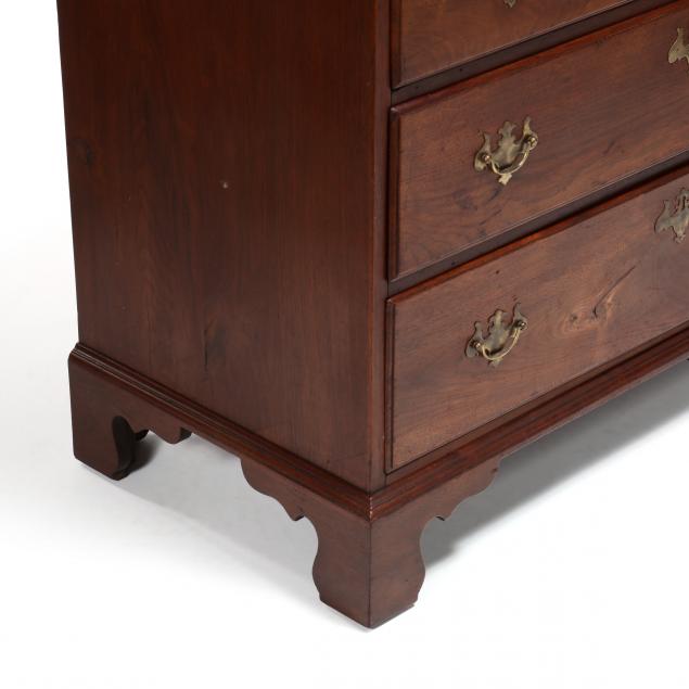 Circa 1800, poplar secondary, rectangular dovetailed case, with applied molded edge, four graduated lipped drawers, molded base, shaped bracket feet with spur.