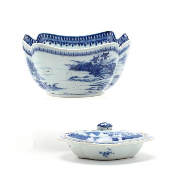 19th century, including a Nanking square center bowl with interior and exterior decoration and a lidded Canton serving dish with pinecone finial and painted interior.