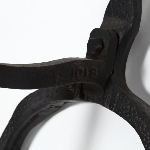 Mid 20th century, reticulated brass with thistle motif, on hammered black painted iron bases, marked.
