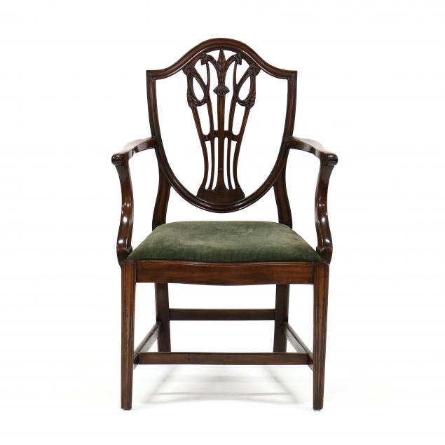 Later upholstery with light staining; joint repair to arms; break and repair to right arm at stile.