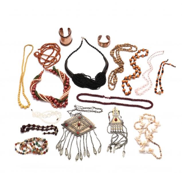 To include: a carved, rectangular wooden box (11.75 x 4.25 x 2.5 in.); a wide copper tone cuff bracelet (3 x 6.25 in.); a wide copper tone cuff bracelet with beaded detailing (1.5 x 6.5 in.); a silver tone fringe pendant with a red glass stone (2.5 x 9.25 in.); a large, marquise shape silver tone fringe pendant with red glass stones and a fancy link chain (chain: 28 in.; pendant: 5.75 x 8.5 in.); a multi-strand black bead necklace with wood detailing (27 in.); a shell necklace (36 in.); a multi-strand brown, cream, and green wood bead necklace (21.5 in.); a square and round bead necklace (51 in.); a black and brown bead necklace (24 in.); a carved wood and orange bead necklace (17 in.); a wood bead stretch necklace (56 in.); a yellow plastic bead necklace (28 in.); a red and gold tone bead necklace (16 in.); a woven garnet bead necklace (24 in.) (damaged); a clear bead necklace (17 in.); a rose quartz and silver bead necklace (25 in.); and a multi-colored agate and quartz bead necklace (39.25 in.).