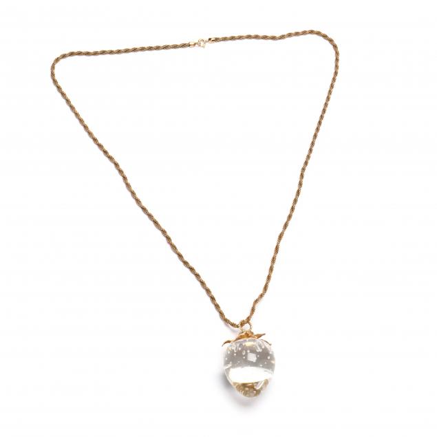 The crystal strawberry pendant with air trapped seeds and a textured gold calyx stamped 18K and signed S for Steuben and with fixed rope twist bail, pendant doubly etched S, suspended from a woven gold chain stamped 14K / Automade.