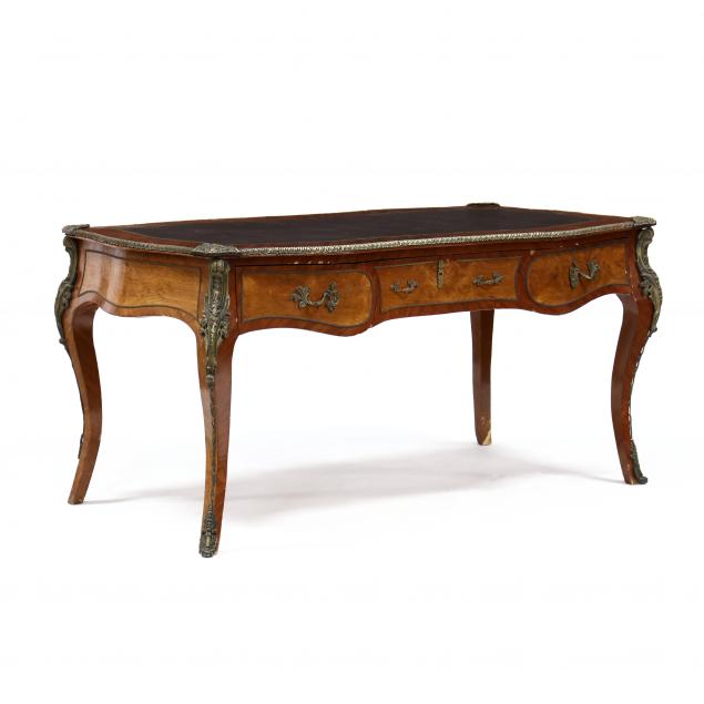Late 20th century, kingwood and burlwood veneers, with ormolu mounts, serpentine form with leather writing surface, case with three drawers on cabriole legs with ormolu mounts, finished on all sides.