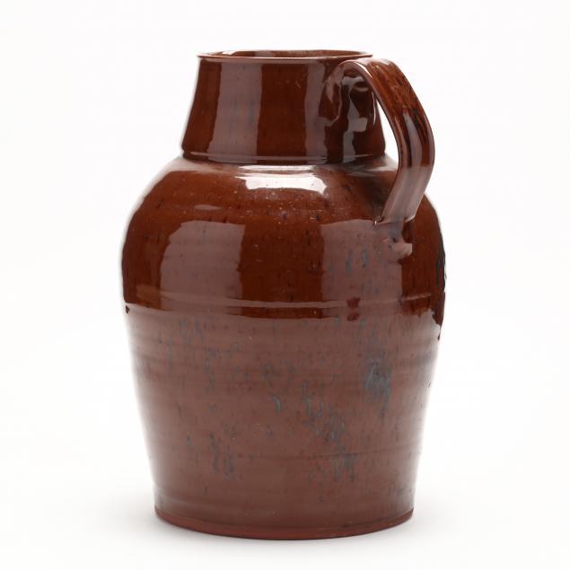 Williamsburg, Virginia, the first a decorated bowl stamped to the unglazed bottom and dated 2001, with coggled wheel rim, (2 x 10.5 in. diameter); the second a large redware pitcher with manganese drips, stamp to the unglazed bottom and applied strap handle, (11.5 x 8 in. diameter).